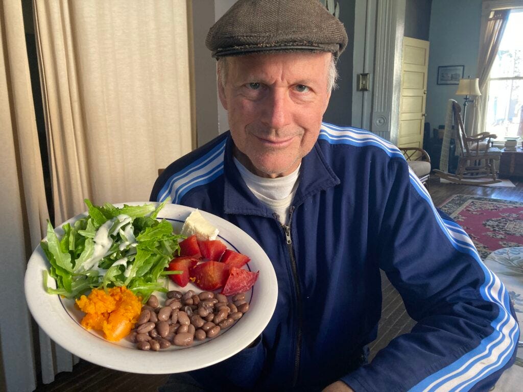 Here’s a pic of today’s dinner: lettuce and spinach, beets, dried beans, and squash all grown in our home garden plots. The salad dressing and cheese are from our neighborhood grocery store, Gateway Market and Cafe.